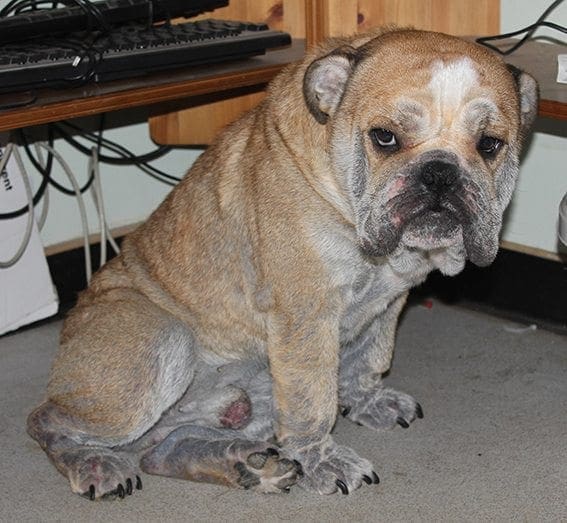 Buster was shut away and forgotten about, his skin problems ignored, he was left to suffer in misery. Grey skin showed through where there should have been thick fur, and there were red sores on his face, paws, and bottom. He was depressed at first but soon came to life again as his treatment with us began to work!