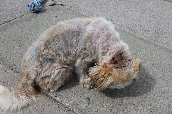It’s hard to believe that Maisie came to us direct from a home in this terrible condition. Her allergies had been completely ignored and she was covered in open sores. Wounds at the back of her neck were bleeding and infected, poor Maisie was in so much pain and discomfort.