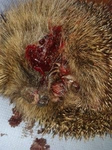 This hedgehog’s wound was inflicted by a strimmer. He lost part of his nose and had a major cut on his face. Happily, he is making a wonderful recovery.