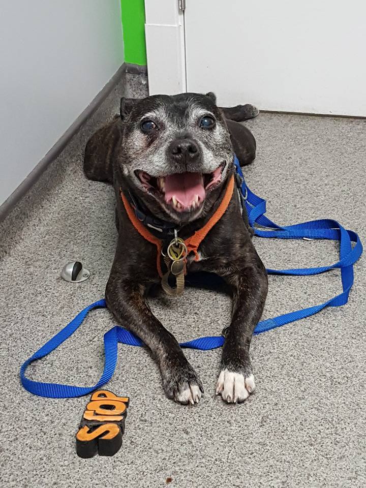 We all fell in love with Monkey, a wonderful Staffordshire Bull Terrier with a fantastic personality, great courage and a big heart. He was quickly adopted. He had a lovely home, but sadly a year later his new dad passed away and Monkey found himself back at Freshfields.